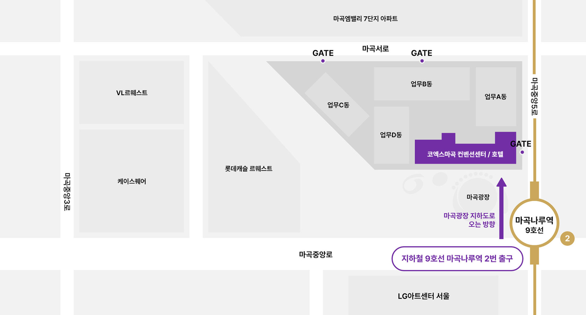 | · 9호선 마곡나루역 - 1,2번 출구 방향 좌측 마곡광장 지하도로 진입 - 2번 출구에서 도보 3분 · 공항철도 마곡나루역 - 6번 출구에서 도보 6분 · 5호선 마곡역 - 1번 출구 도보 15분 |