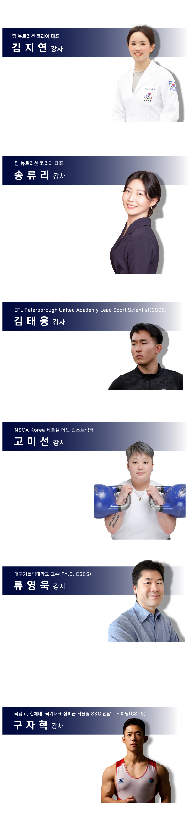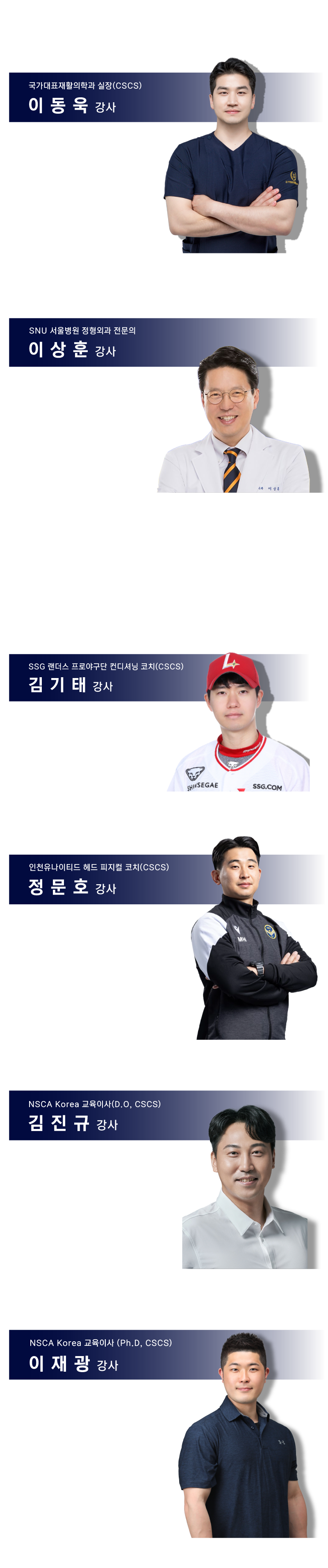 김 진 규 NSCA Korea 교육이사(D.O, CSCS) CSCS, NSCA-CPT 차의과대학교 박사(통합의학) 강남대학교 체육학과 강사 NSCA Korea 상급 재활운동전문가 메인강사 NUMSS Doctor of Osteopathy 건강운동관리사 FIFA Diploma in Football Medicine (전)차움의원 운동처방사 NSCA 퍼스널 트레이닝의 정수, NSCA 스포츠와 운동영양 가이드, 치료적 스트레칭, 척추측만증 분석 등 공역 및 감수 | ||