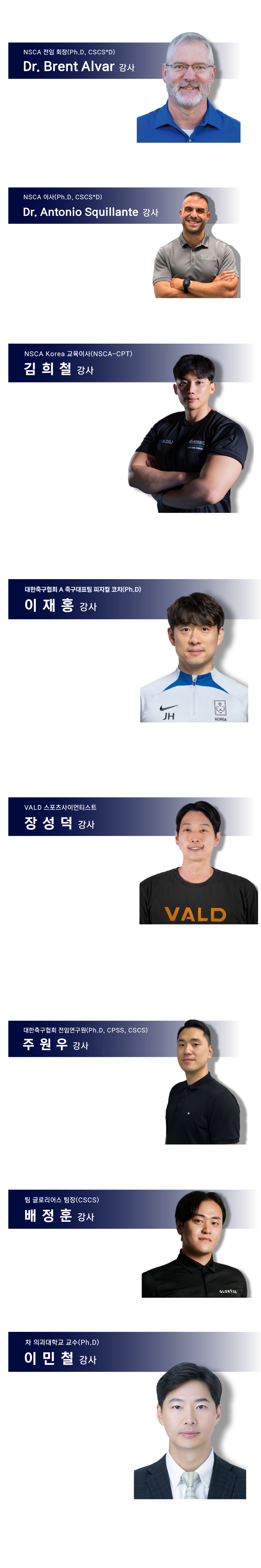 Dr. Antonio Squillante NSCA 이사(Ph.D, CSCS*D) CSCS,*D, NSCA-CPT,*D Point Loma Nazarene University 교수(Kinesiology) 미국 사이클링 국가대표팀 트랙 스프린트 스포츠 퍼포먼스 및 트레이닝 총괄 책임자 PhD, RSCC*D | ||