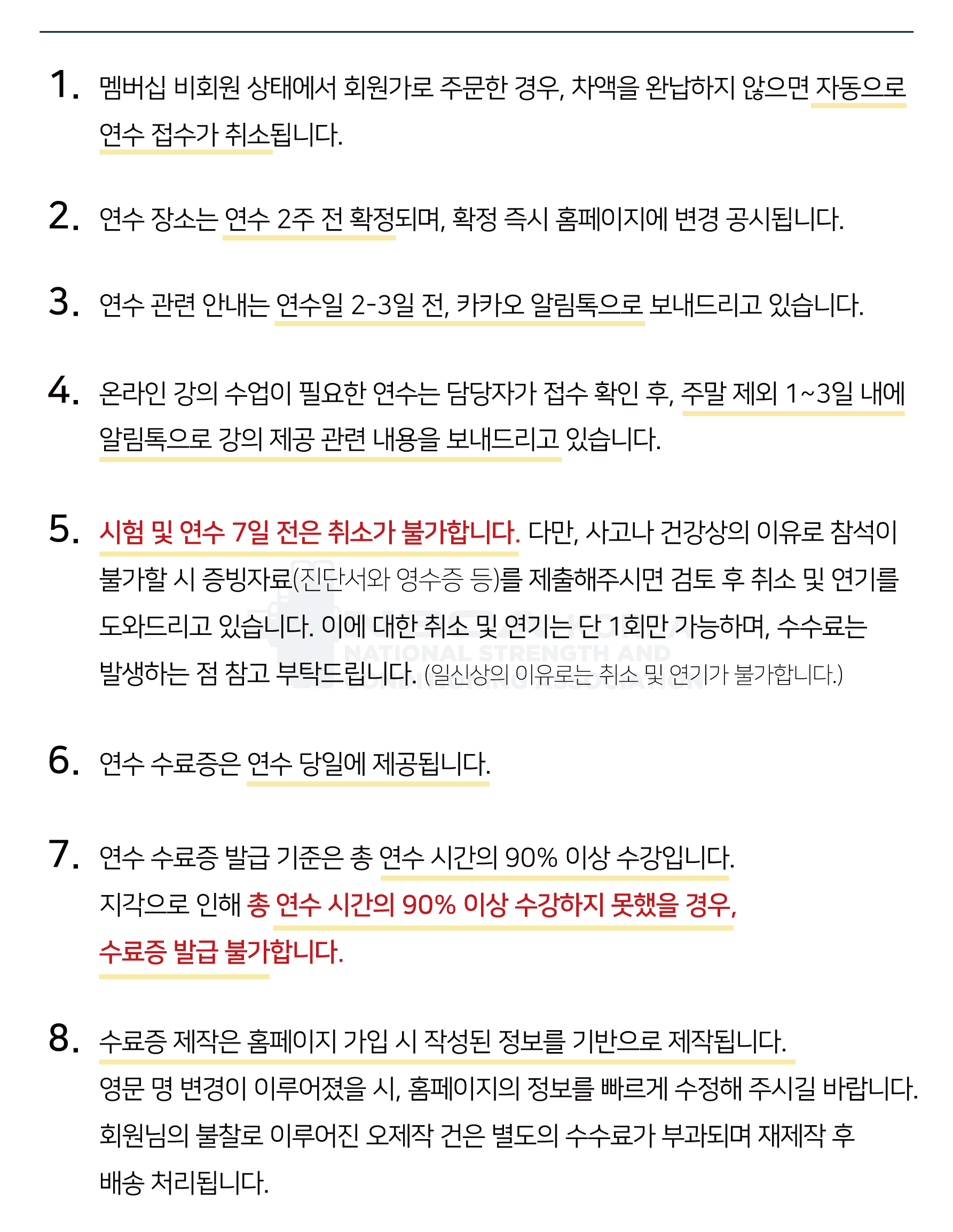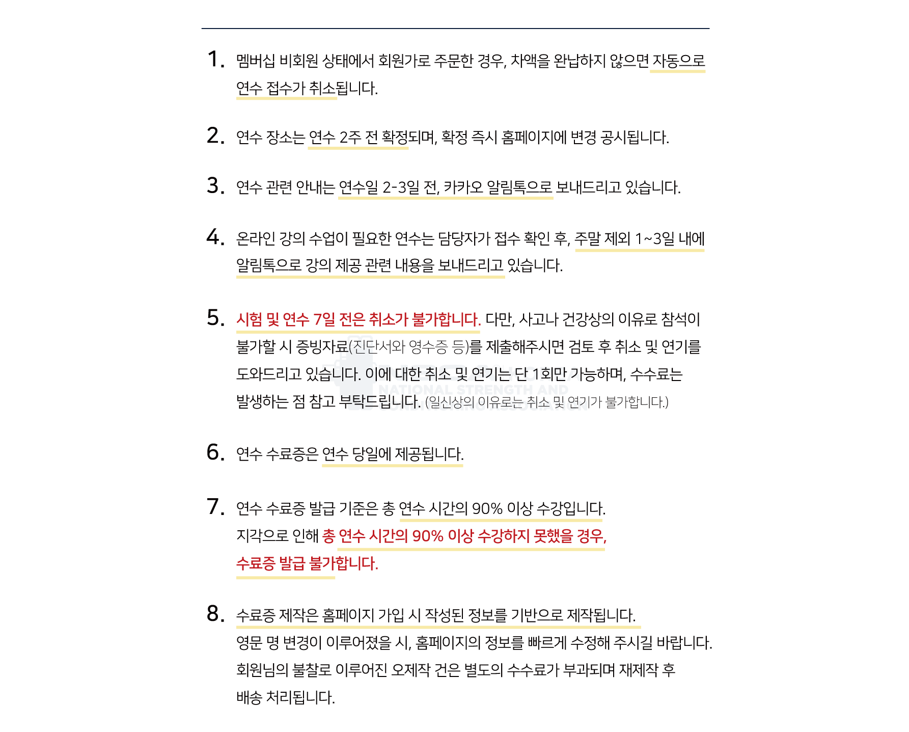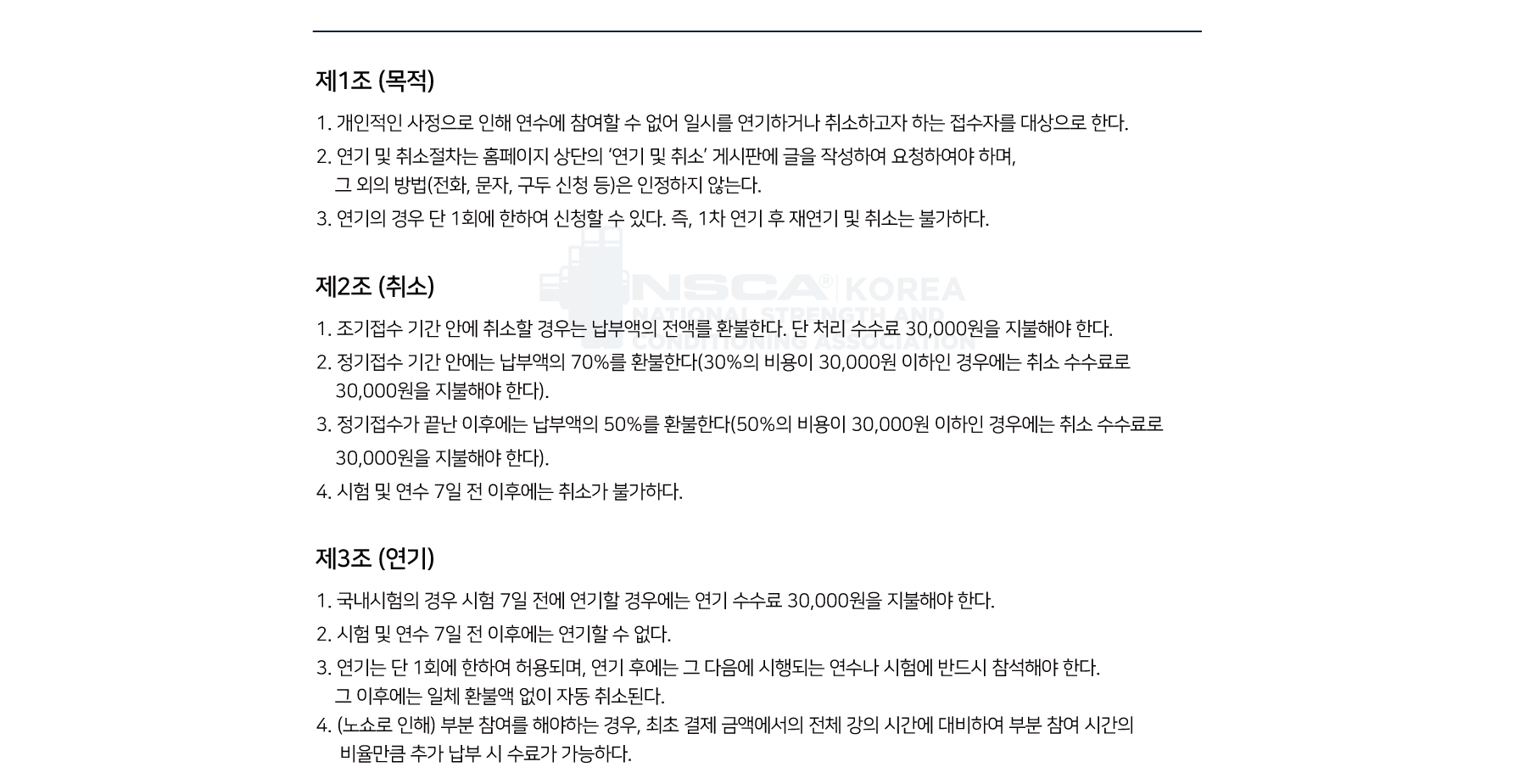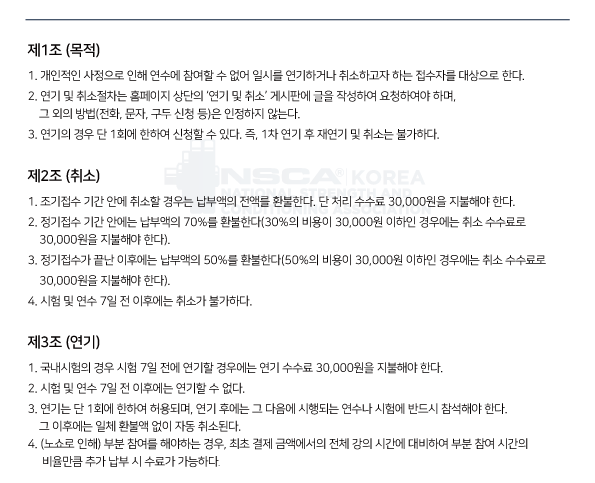 NSCA Korea 국내 실기 연수 취소 및 환불 규정